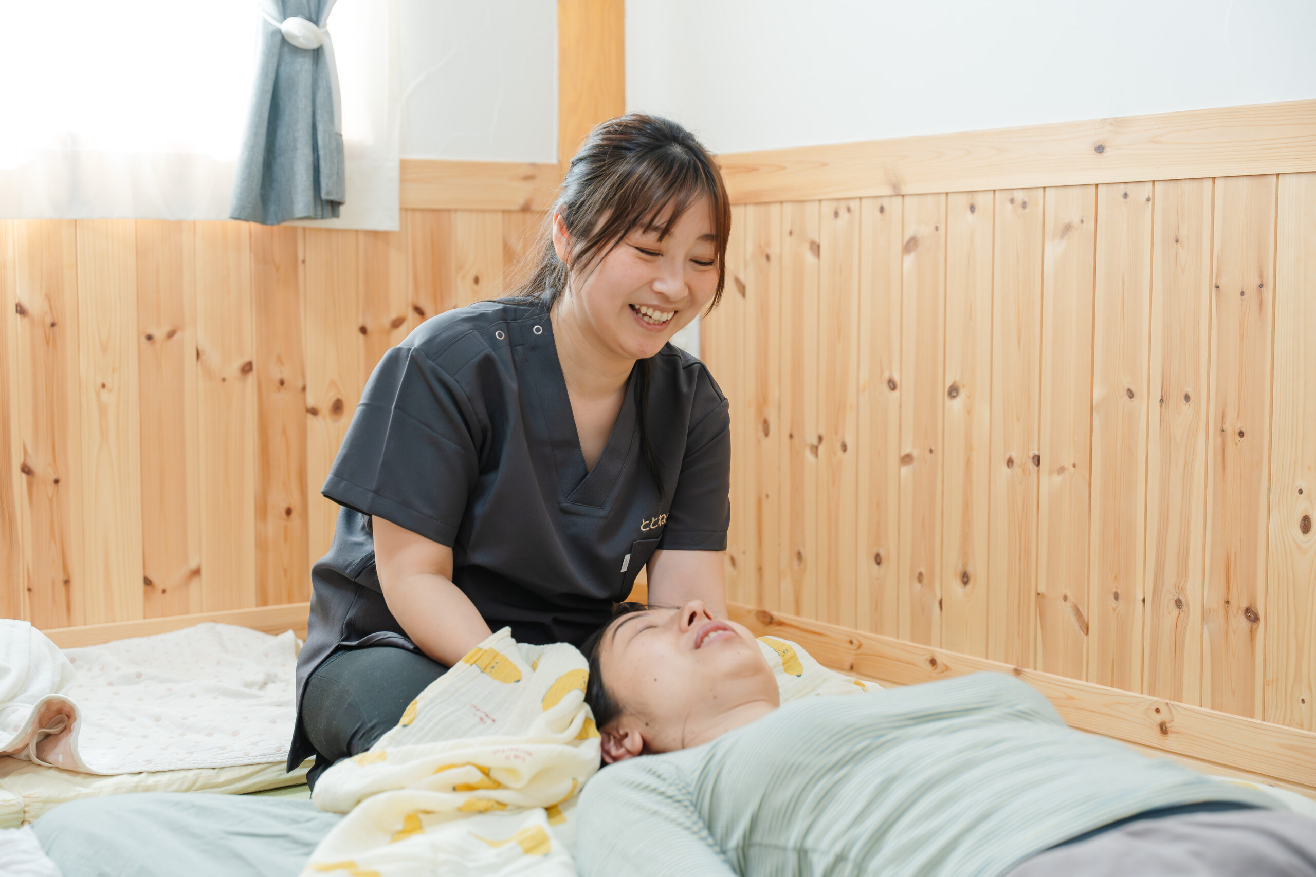 妊娠準備、妊娠中、産後の女性が対象です。不調のある部位に関わらず、頭から足先まで全身に触れていく、痛みのないケアです。身体のバランスが崩れるなどして負担のかかっているところに対して、適度に緩めていくことで、筋肉の余計な緊張を取り除き痛みの緩和を目指します。お一人お一人の身体の状態に合わせたケアに努めています。